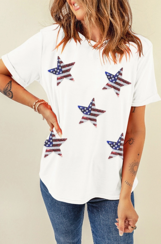 Sequined American Flag Star Tee [White]